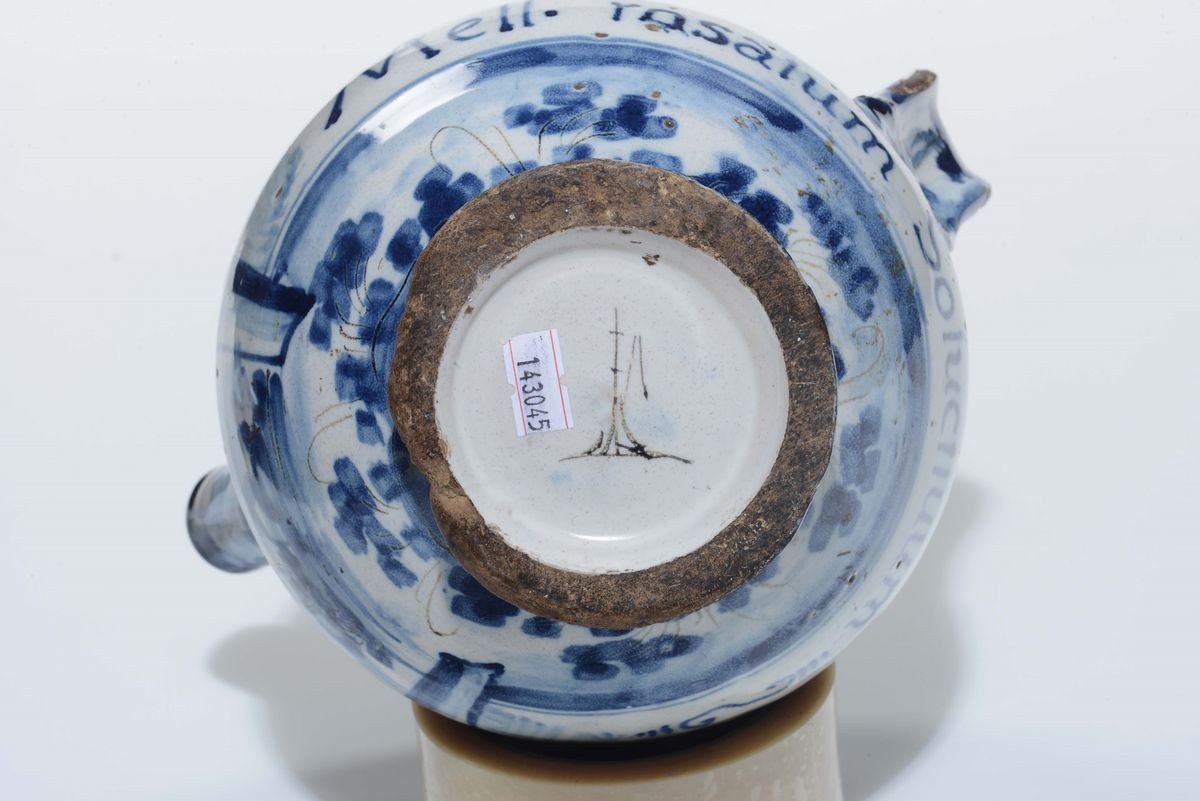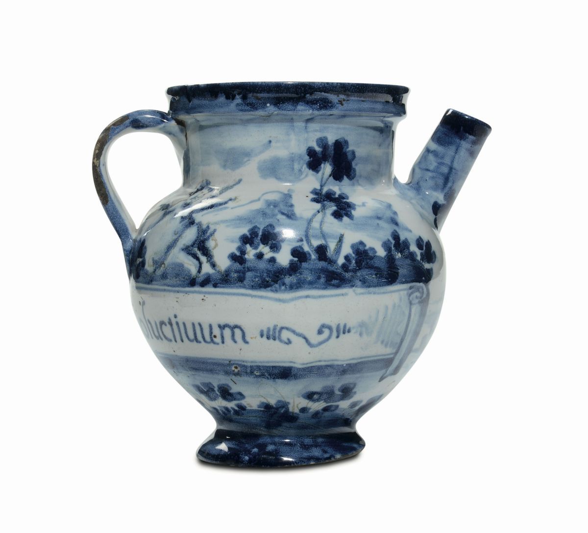 Boccale in maiolica di farmacia con decoro a scenografia barocca, Savona XVIII secolo