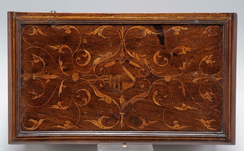 Cassina rettangolare in legno di noce intarsiata con varie essenze. Italia centrale, Emilia (?) XVI secolo