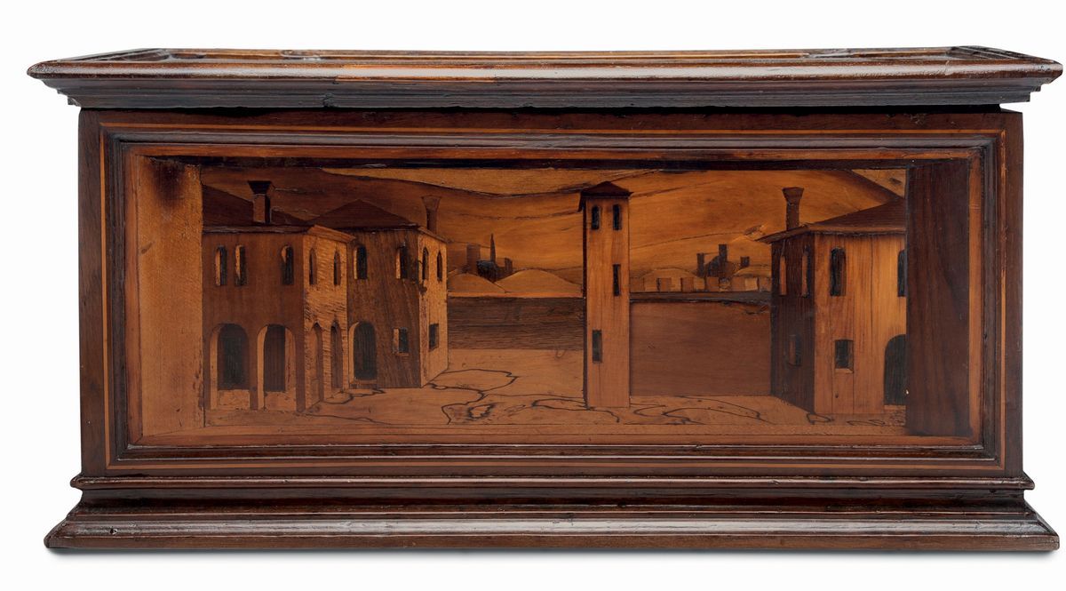 La decorazione a tarsia della rara cassina rinascimentale, eseguita in varie essenze di legno, derivano chiaramente dai modelli prospettici di architetture e paesaggi introdotti dal linguaggio pittorico tardo quattrocentesco. Nella tarsia lignea italiana del XV secolo si era sviluppata una ricerca in tale senso come si può riscontrarvi in molte complesse opere tra cui ricordiamo, oltre al celeberrimo studiolo di Urbino, le opere come quelle eseguite da Fra Giovanni da Verona (1457-1525) nella chiesa di S.Anna dei Lombardi a Napoli e da Pier Antonio da Modena nel 1475 circa nel Duomo di Padova.Cm 43x25,5x20,5