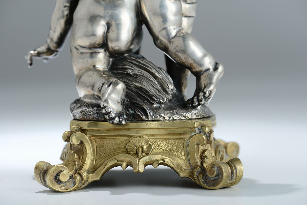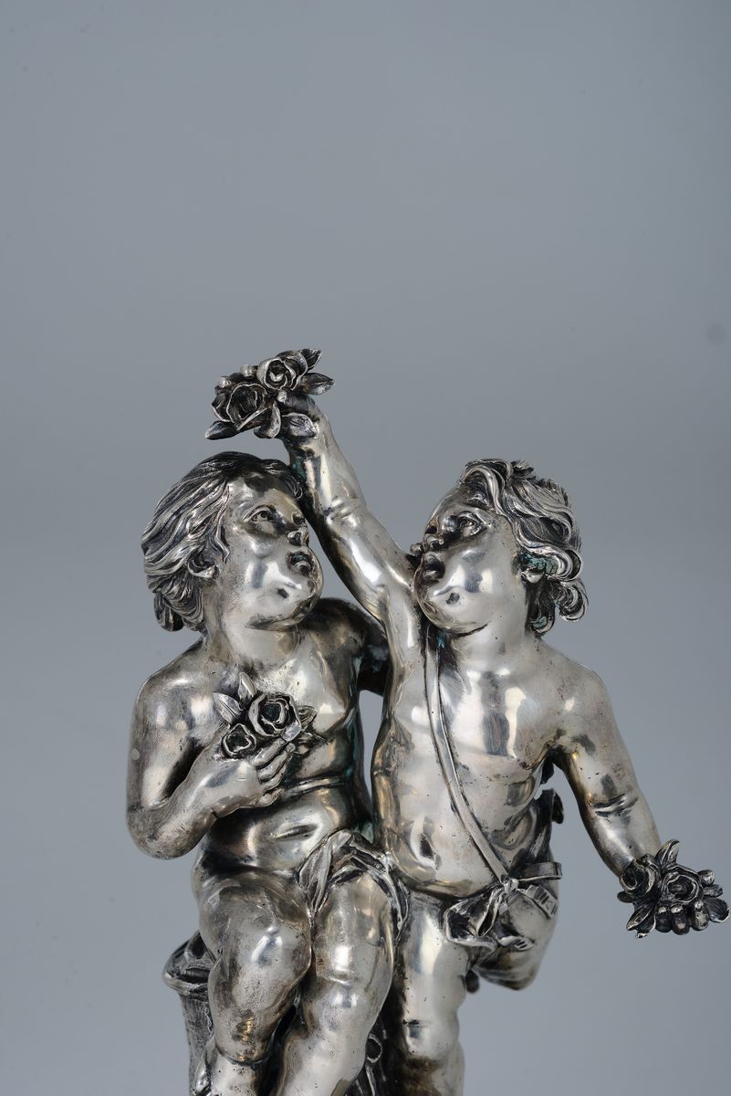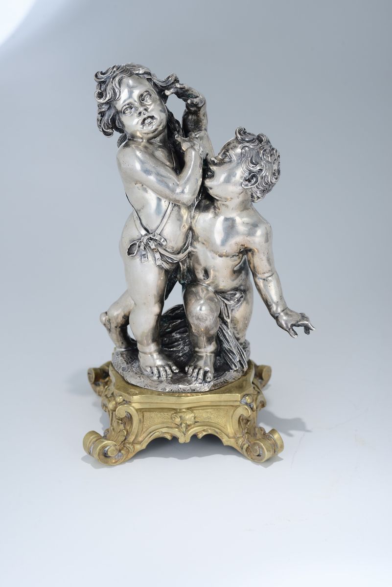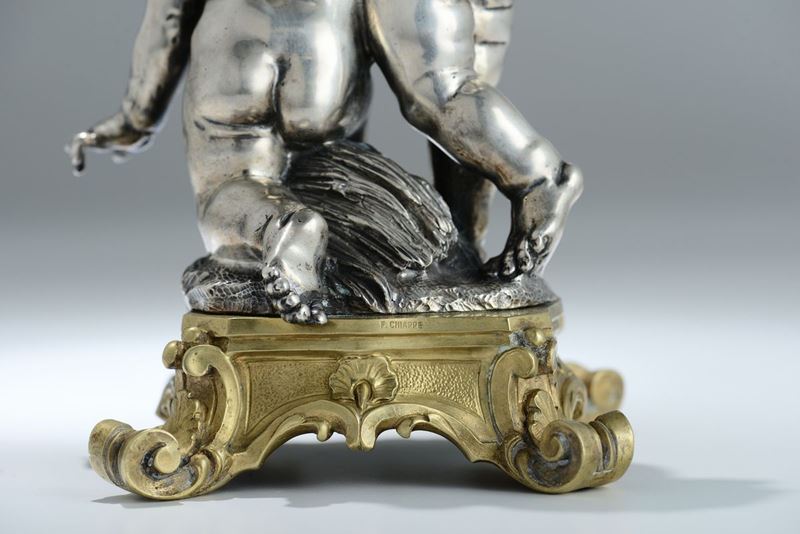 Coppia di composizioni scultoree raffiguranti putti che giocano in argento fuso e cesellato e basi in metallo dorato. Argentiere [..]