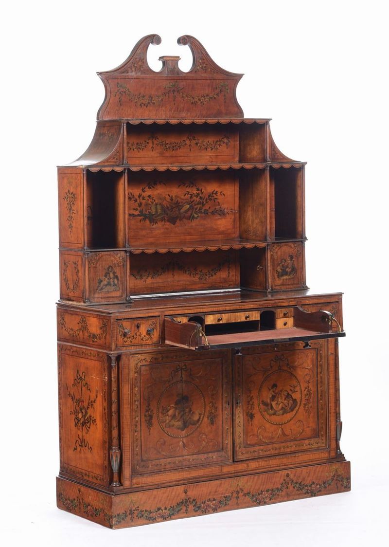 interamente decorata in policromia, base a due ante con festoni fioriti, al centro dei pannelli scene di putti; colonne tornite sui montanti. Fascia superiore con due cassettini e calatoia centrale con scrittoio a scomparsa, alzata con sportelli e vani a giorno terminante con cimasa a timpano spezzato, cm 123x50x212