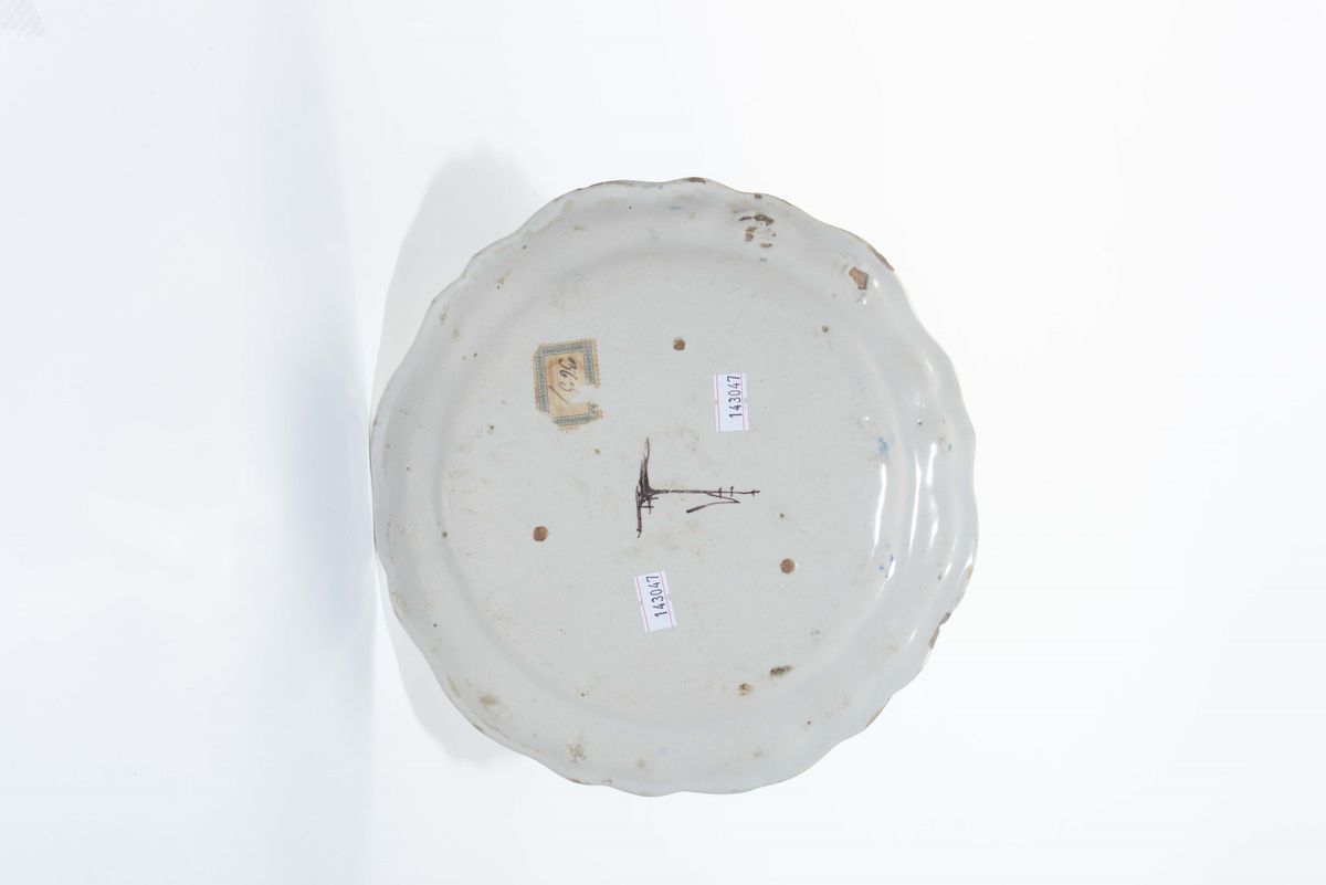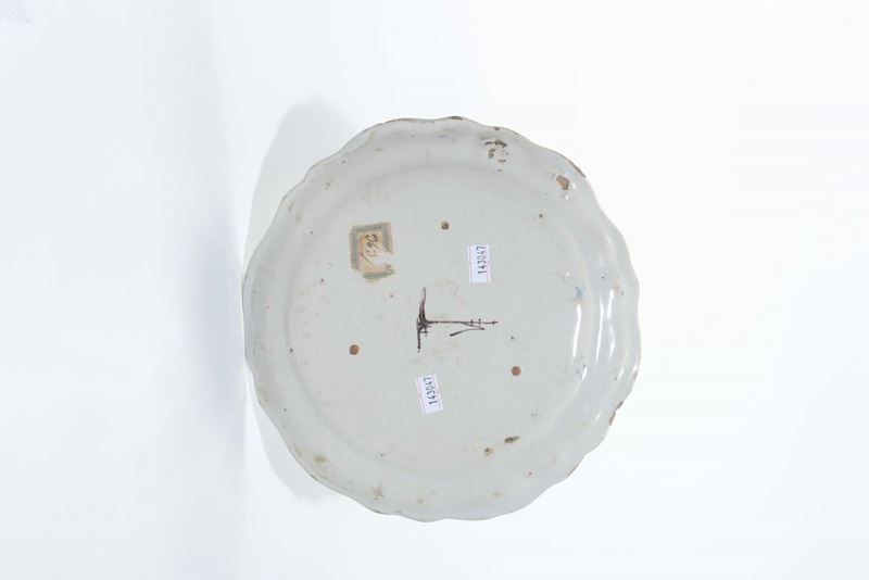 Maiolica a gran fuoco in policromia, diametro cm 22,5 e cm 23,0 Alcune sbeccatureDecorazione “a figure” con architettura e alberelli.Corpo circolare, bordo orlato, fondo piatto. Uno dei piatti marcato lanterna, in bruno di manganese.