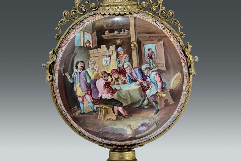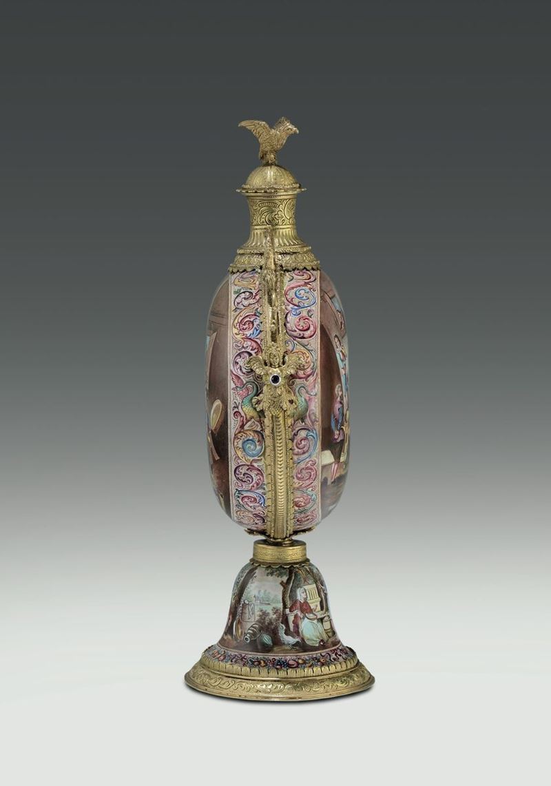 Importante fiasca in bronzo fuso, cesellato e dorato e rame dipinto a smalti policromi. Storicismo viennese della seconda [..]