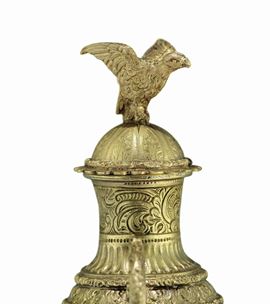 Corpo globulare schiacciato con guance dipinte con scene di osteria, finimenti in bronzo dorato a volute sui lati esterni, collo con decori cesellati e tappo terminato con volatile nell'atto di spiccare il volo. Piede a campana dipinto con scene di mercato.Altezza cm 30,5