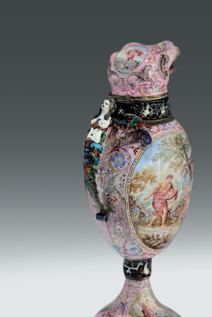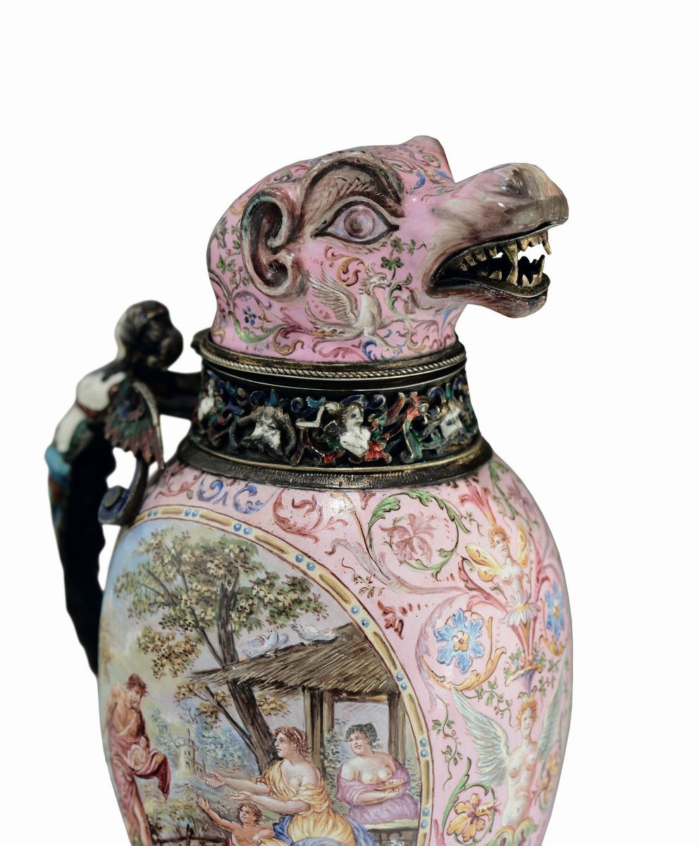 Il raffinato versatoio, ispirato ai modelli dell’oreficeria del’500 tedesco, presenta il corpo interamente dipinto a smalti policromi su fondo rosa con motivi floreali e zoomorfi. La parte centrale di forma ovoidale presenta un medaglione ovale dipinto con scene a carattere mitologico che si ripetono sulla base del piede. La parte alta termina con foggia di testa di cane ringhiante con il collo cinto da un collare magistralmente decorato con smalti a rilievo di gusto rinascimentale da cui diparte un manico ad ansa in argento fuso e smaltato a forma di cariatide alata.Altezza cm 23