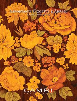 decorato da cornicette intagliate alla fiamminga, sportellino centrale intagliato con figure di cariatidi ai lati e decorato da Minerva al centro, il tutto poggiante su quattro piedi scolpiti a guisa di leoni in legno dorato, sulla sommità ringhierina [..]