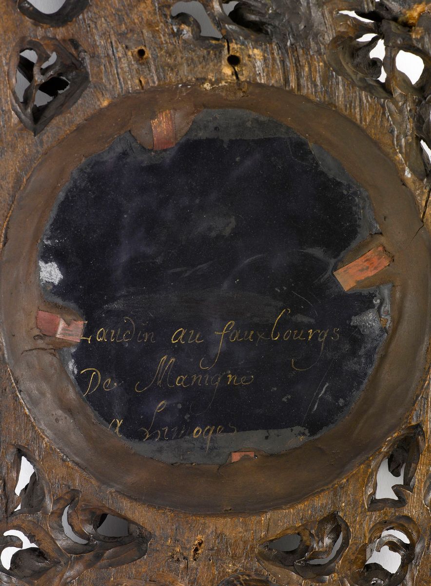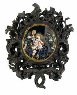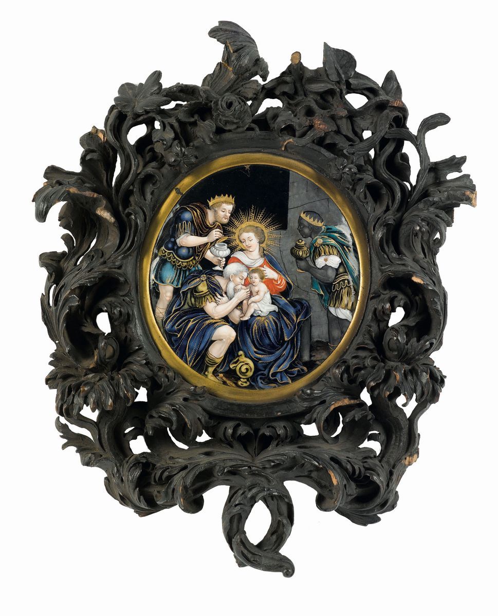Placca in smalti policromi raffigurante Adorazione dei Magi entro cornice in legno intagliato. Limoges XVII secolo
