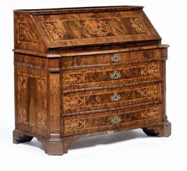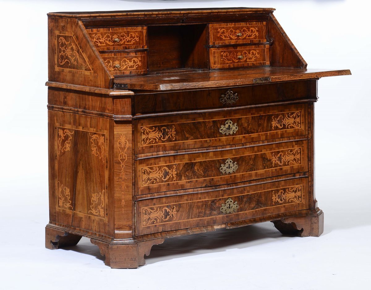 fronte mosso a quattro cassetti, calatoia celante quattro cassettini e vano a giorno centrale, decori intarsiati in legno chiaro a rocailles, cm 130x63x113