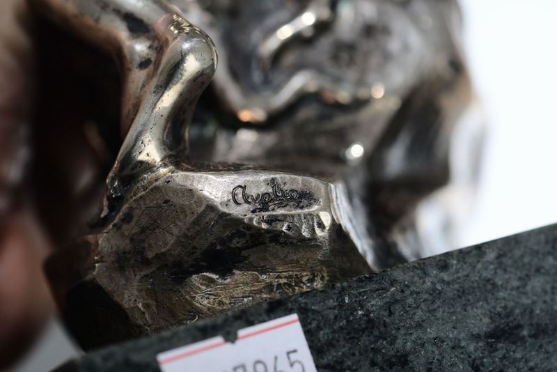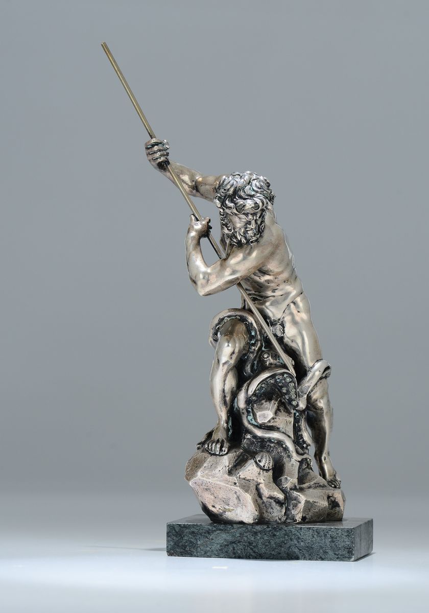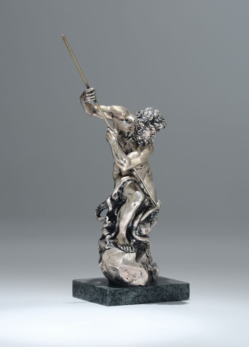 Scultura in argento fuso e cesellato su base in marmo verde raffigurante Nettuno che lotta con una piovra, argentiere fonditore [..]