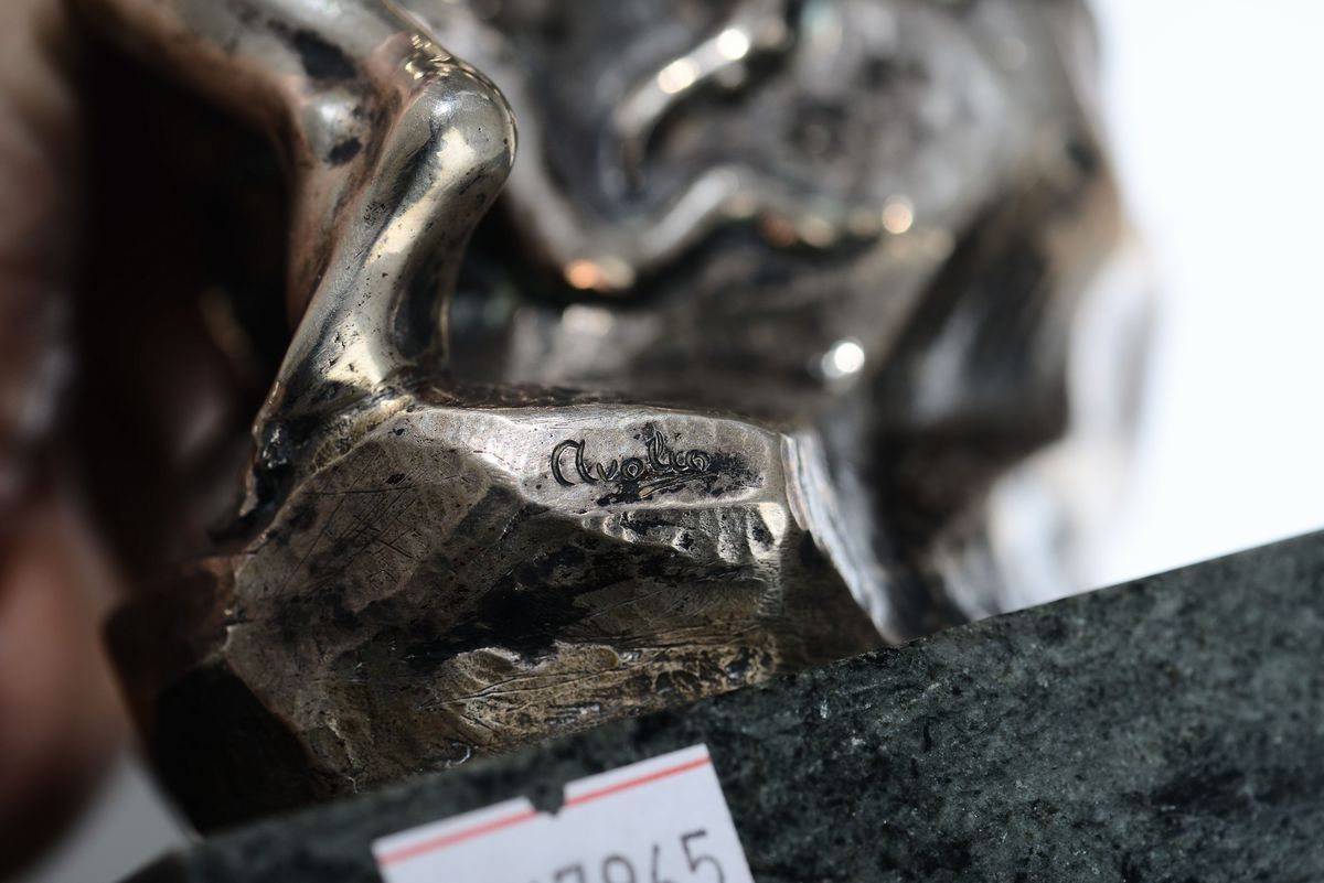 Scultura in argento fuso e cesellato su base in marmo verde raffigurante Nettuno che lotta con una piovra, argentiere fonditore Luigi Avolio, Napoli terzo quarto del XX secolo
