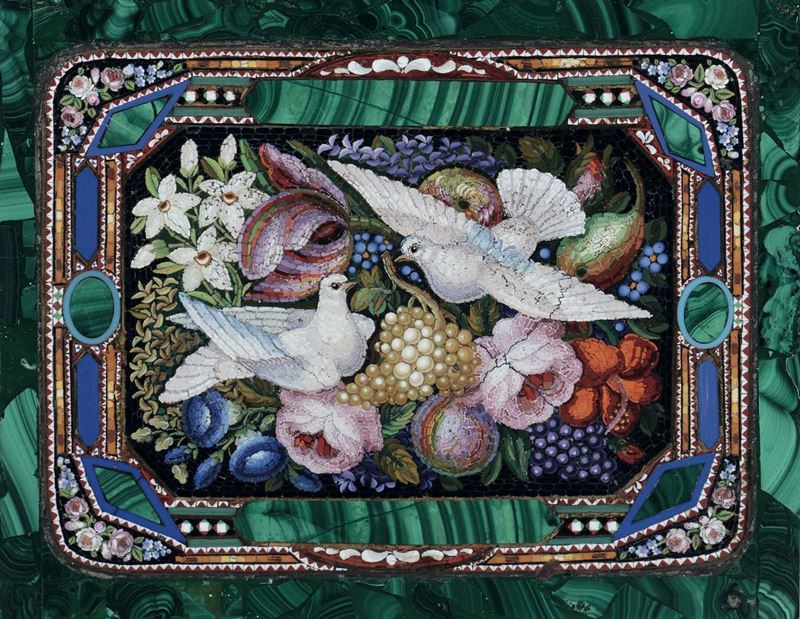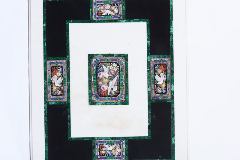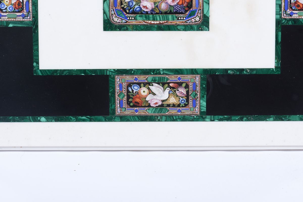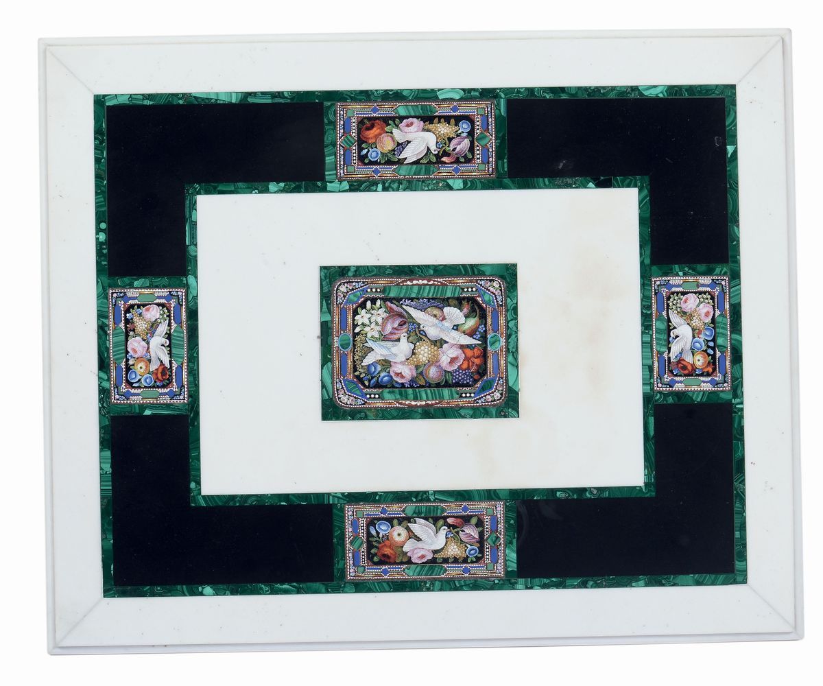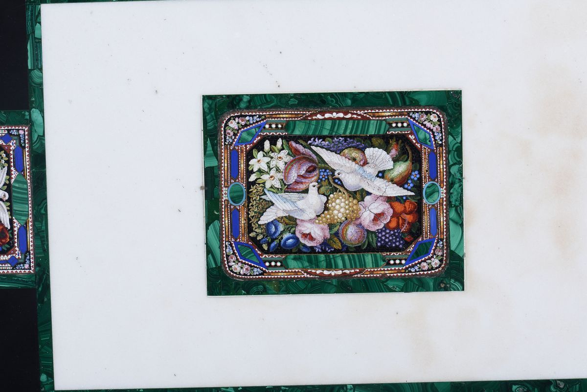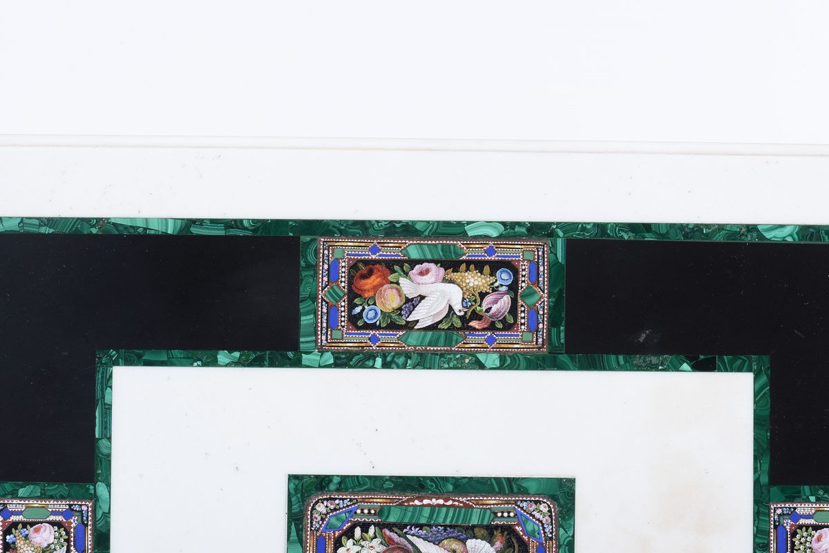 Tavolino con piano in marmo intarsiato in malachite e micromosaici, XIX secolo