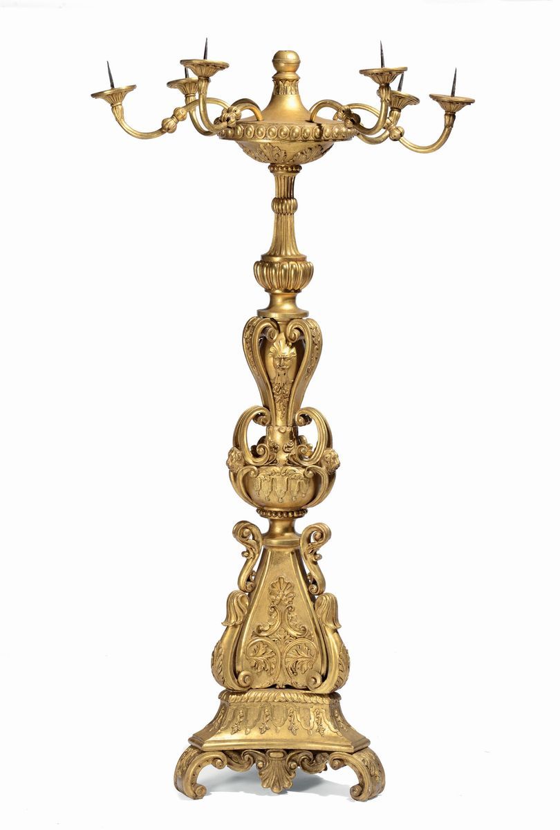 Torciera Luigi XVI a sei luci in legno intagliato e dorato, Toscana, XVIII secolo