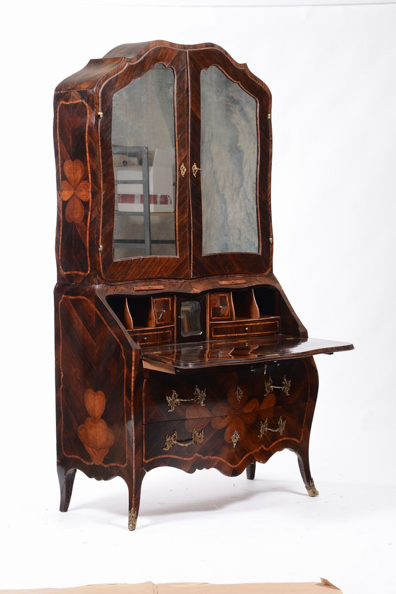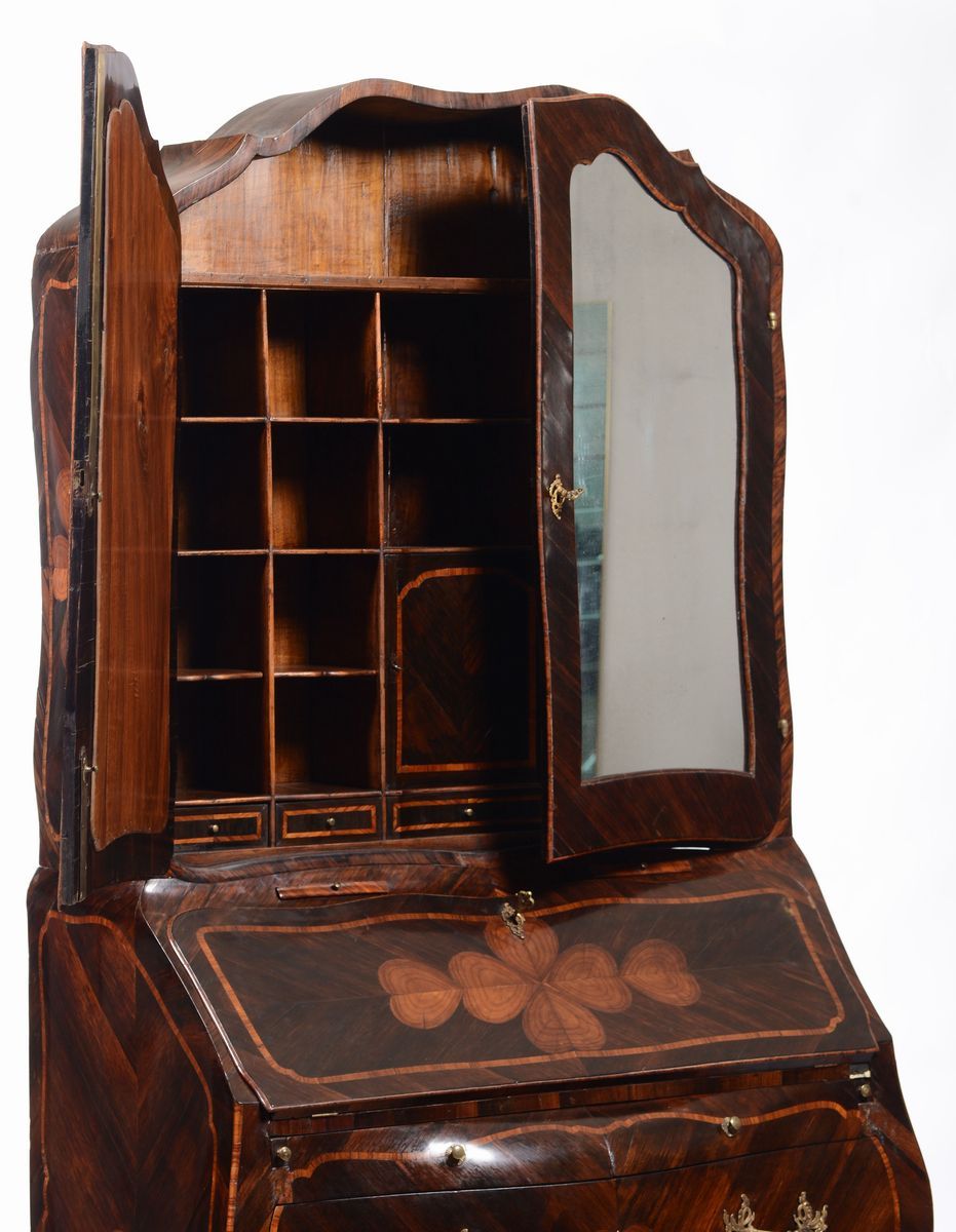 sul fronte due cassetti grandi e due piccoli affiancati, alzata sagomata al centro con due sportelli a specchi, maniglie, bocchette e scarpette in bronzo cesellato e dorato, interno della ribalta mosso con sportello centrale, due cassetti e vani a giorno, interno dell’alzata con sportellino, cassetti e numerosi vani a giorno portacarte, cm 116x58x224