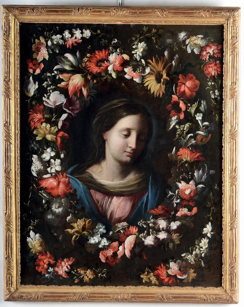 Pittore Emiliano del XVII secolo Coppia di dipinti con figure e corona di fiori