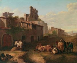 Pittore Fiammingo attivo in Italia nel XVIII secolo Paesaggio con armenti e architetture sullo sfondo