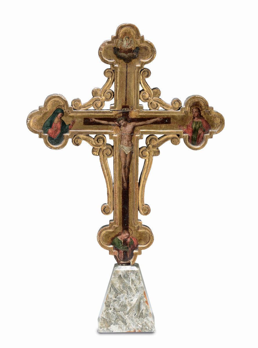 Scuola Emiliana del XVI secolo Croce su fondo oro dipinto su ambo i lati con rappresentati i quattro evangelisti sui lati [..]
