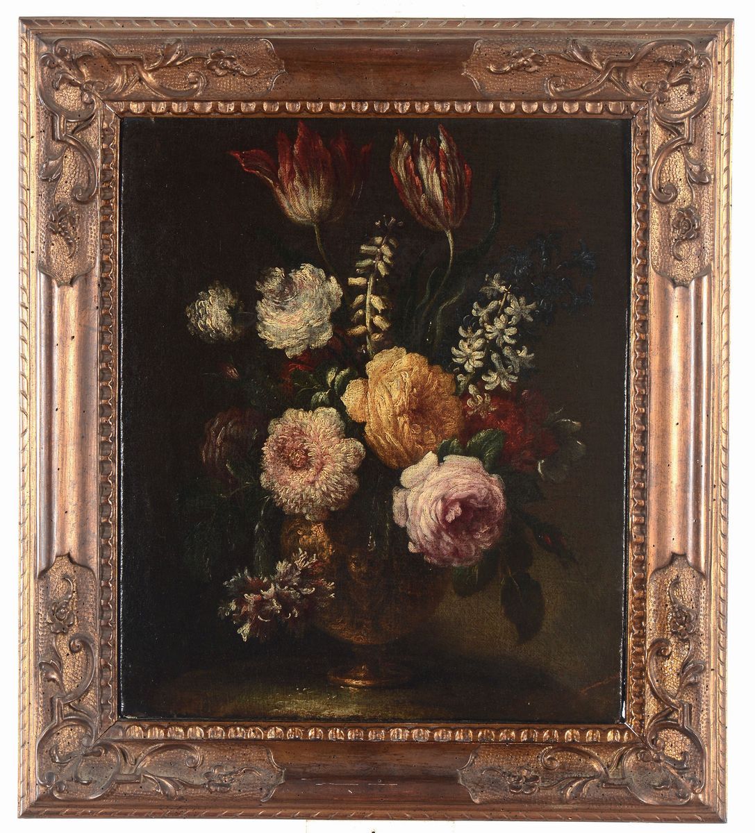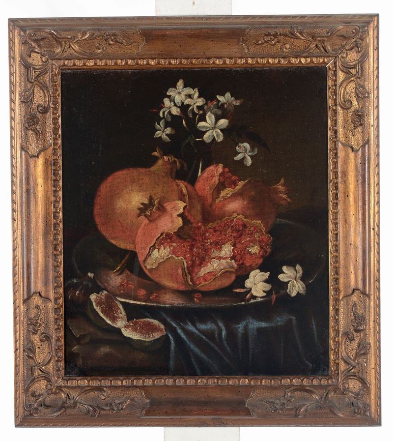 Scuola Romana del XVII-XVIII secolo Natura morta con melograno Vaso di fiori