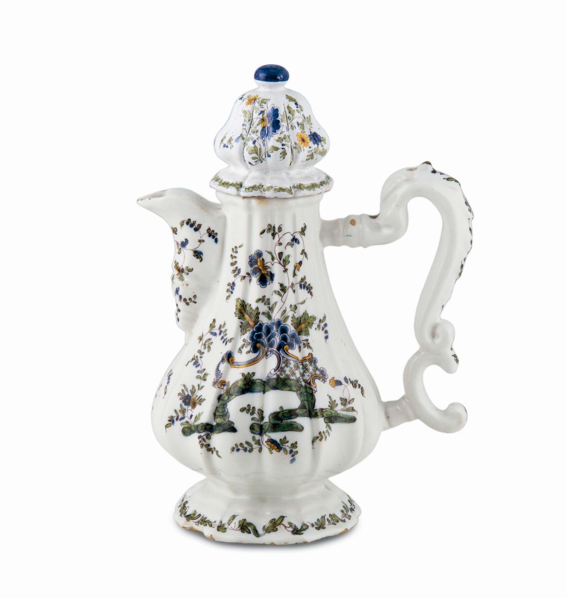 Maiolica policroma a gran fuoco, altezza cm 26,0 circaLievi sbeccature. Coperchio non pertinente.Corpo piriforme costolato, basso piede orlato e incavato. Manico a doppia voluta e coperchio “alla persiana“. Versatoio “a becco”.Decoro “al ponticello “dalla cui radice, all’orientale, si sviluppa un disegno con eleganti rocaille, graticcio, ventaglio di petali blu fra tralci di steli fioriti e fogliati. Ai bordi una catenella di piccole foglie.