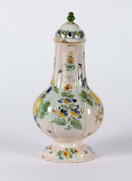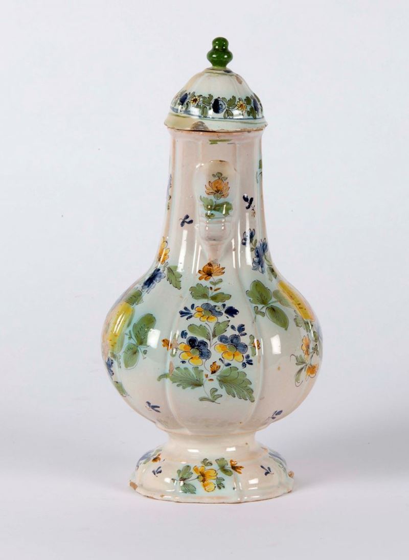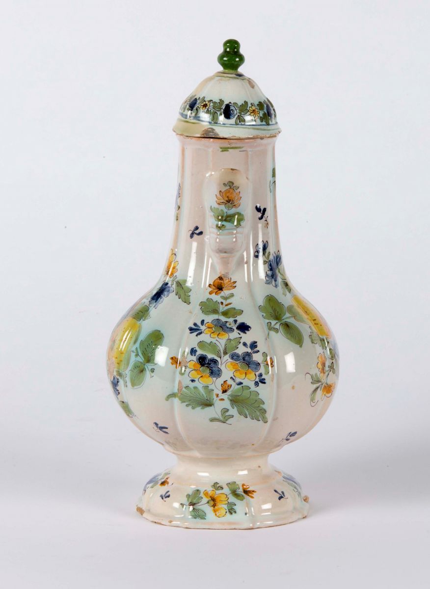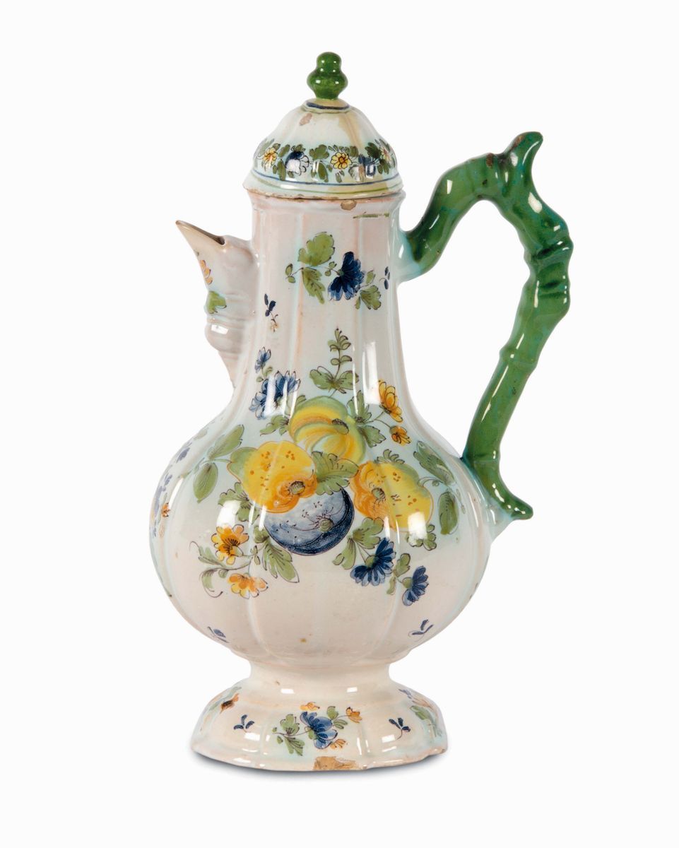 Maiolica policroma a gran fuoco, altezza cm 27,5Coperchio non pertinente.Corpo piriforme, costolato, rastremato alla base orlata e incavata. Ansa ad orecchio con elso. Versatoio cuspidato. Coperchio a cupola con presa “ a pigna”.Decoro con frutti, tralci di fiori e piccole foglioline disposti a pieno campo sul ventre della caffettiera. Tavolozza languida.