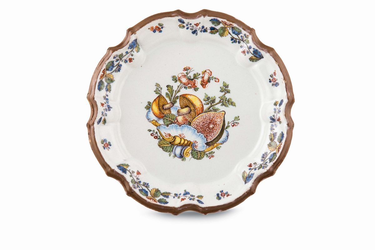 Maiolica policroma a gran fuoco, diametro cm 23,7Buono statoCorpo circolare, bordo a lobi regolari convessi e concavi, modanati, base piana.Interessante decoro “alla frutta“ con ortaggi e fiori sopra un elegante motivo “a rocaille“ insieme a tralci fogliati. La tesa è percorsa da quattro lunghi tralci di fiori e foglie, intervallati da piccoli fiori recisi.