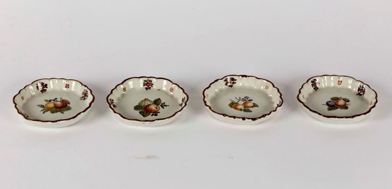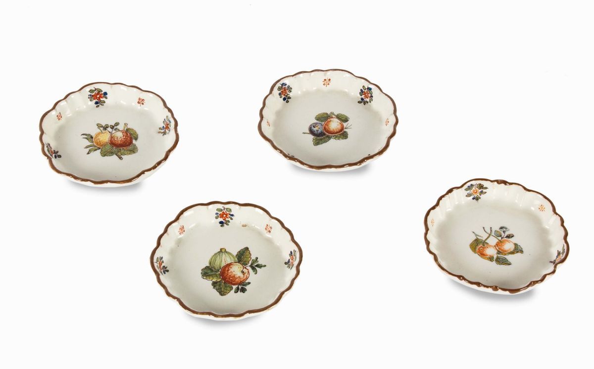 Maiolica policroma a gran fuoco, diametro cm 11,2 cadaunoBuono stato, lievissime sbeccatureCorpo circolare, prodotto a stampo, bordo rialzato e orlato a sei lobi regolari, fondo piano.Rara tipologia con decoro “alla frutta“ e con piccoli tralci di fiori fogliati, crocette quadripartite disposte sul bordo.