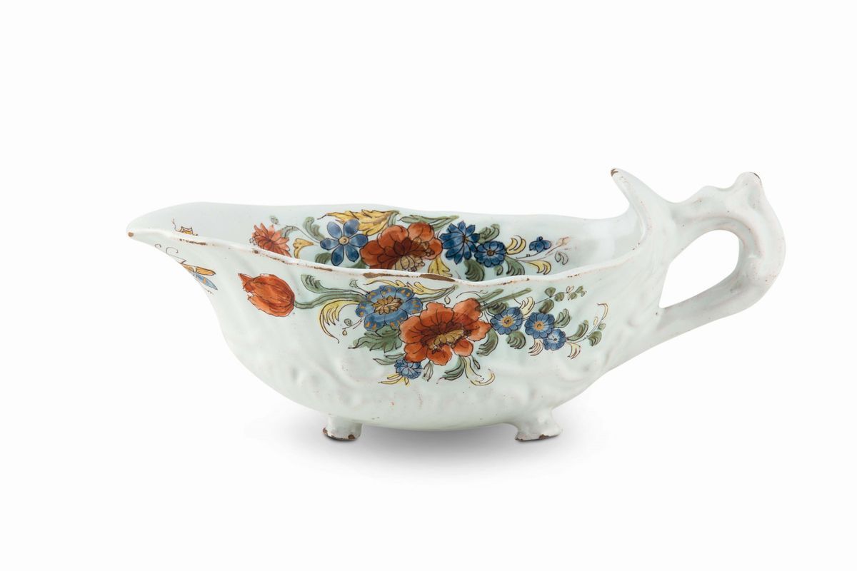 Maiolica policroma a terzo fuoco, altezza cm 8,2 ; lunghezza cm 21,5Lievissime usure ai bordiCorpo “ a navicella “ con rocaille in bassorilievo , bordi orlati, base su tre piedini zoomorfi, ansa ad orecchio con elso.Decoro floreale con fiori vari dipinti su entrambe le facce. All’interno una farfalla in volo e nel centro lo stemma, reale (di un principe), non identificato.