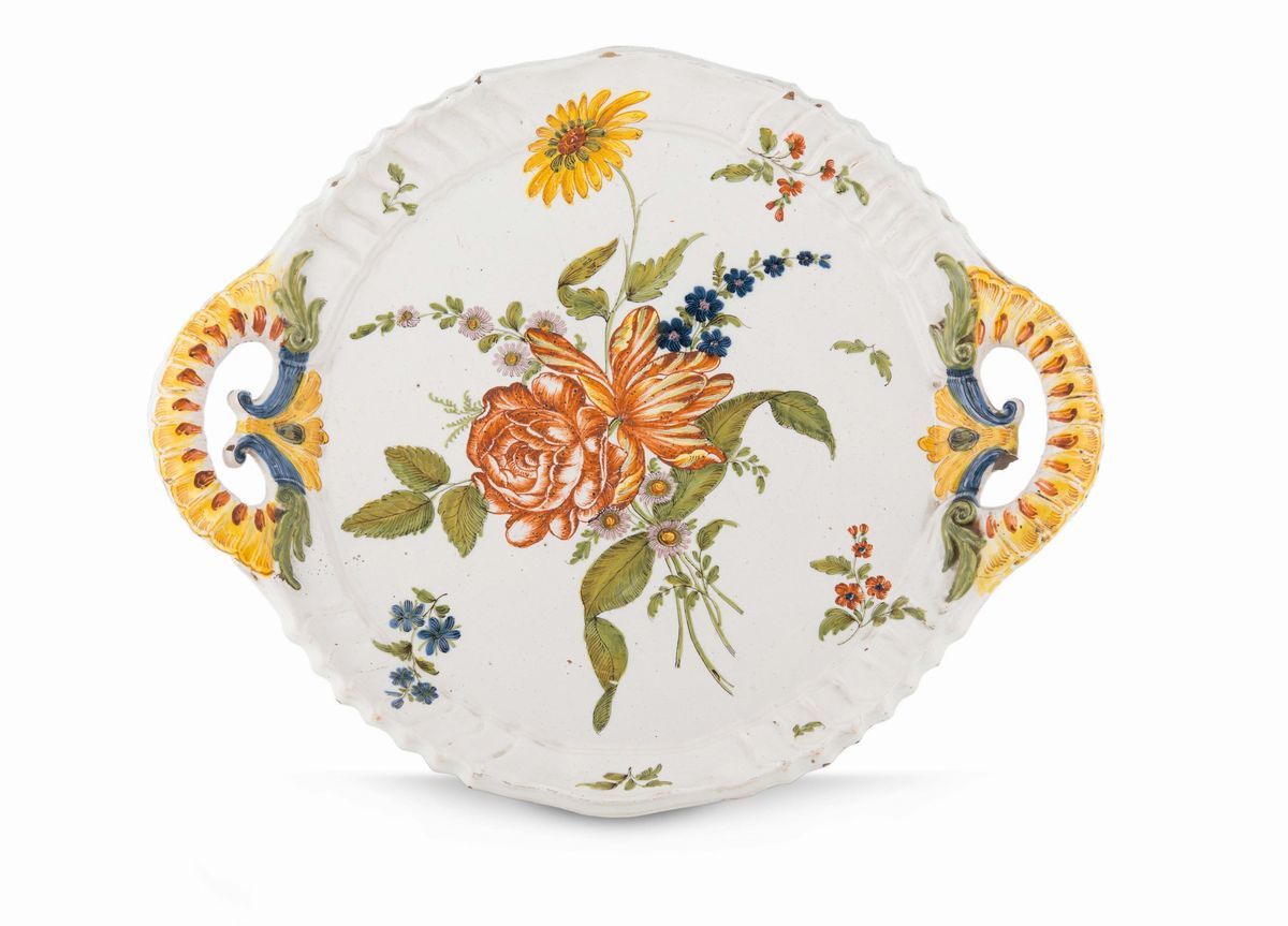 Maiolica policroma a gran fuoco, dimensioni cm 37,5x45,0Piccolissime sbeccature, visibili. FelaturaCorpo circolare, tesa con nervature, prese laterali traforate e baccellate. Base piana.A pieno campo, un elegante mazzo con una rosa, tulipano e fiori vari insieme a foglie lanceolate e non. Fiori recisi e piccoli tralci fogliati disposti senza ordine.