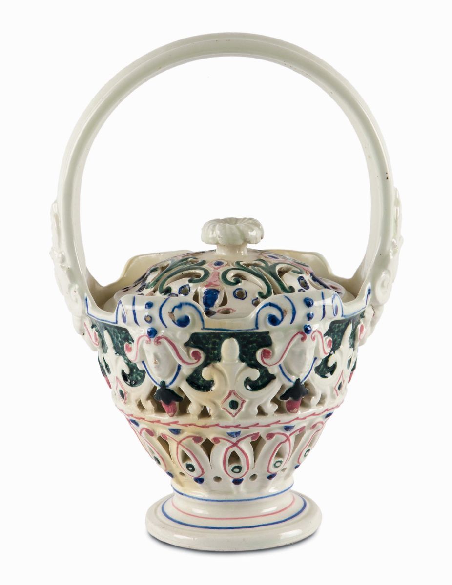 Terraglia policroma a gran fuoco, altezza cm 23,0Buono statoCorpo ovoidale a parete traforata con mascheroni. Base circolare. Bocca dal bordo sagomato a rocaille. Grande ansa a nastro. Coperchio a cupola.Il decoro, policromo, ricalca anche solo parzialmente i vari rilievi in corrispondenza delle parti traforate.Marca , incussa nella pasta, BL PESARO