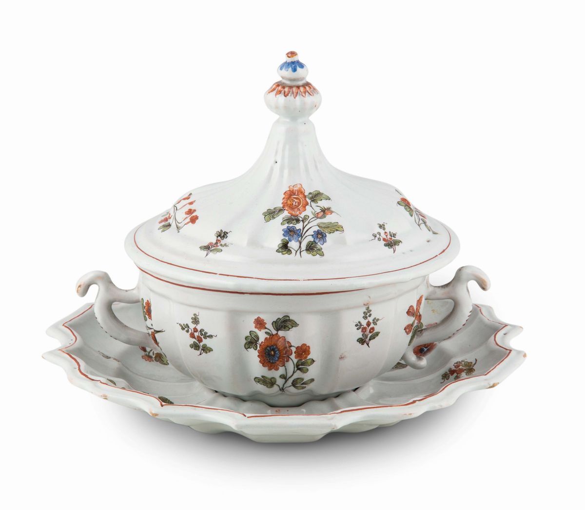 Maiolica policroma a gran fuoco, tazza altezza cm 16,5; presentatoio diametro cm 22,5 circaPiccolissime sbeccatureTazza dal corpo semisferico, costolato, basso piede ad anello. Anse mistilinee. Coperchio “a pagoda“, costolato, presa a pigna. Vassoio a quattro grandi lobi a due a due simmetrici e contrapposti. Piede ad anello rilevato.Decoro “a fiori recisi“, disposti in modo sparso oltre a piccoli tralci fioriti e fogliati. I bordi profilati in rosso ruggine.