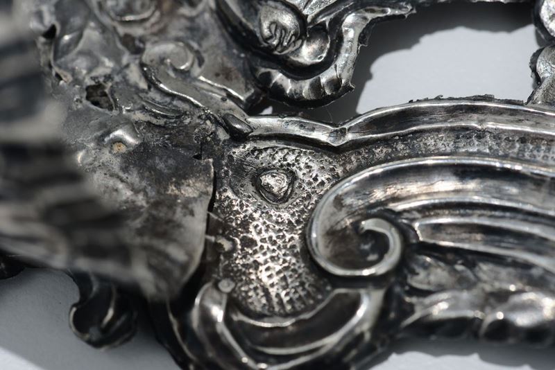 Acquasantiera in argento raffigurante l’Immacolata in argento sbalzato e cesellato, Genova XVIII secolo,punzone di controllo o di ricognizione con testa di mercurio in uso dal 1 settembre al 31 ottobre 1809