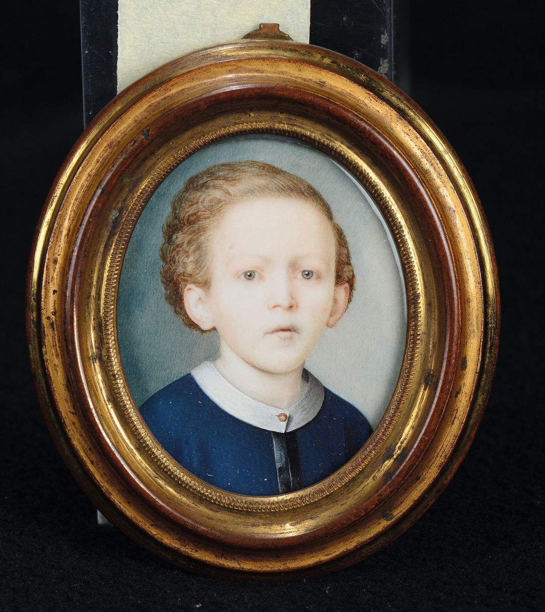 La gamma cromatica del ritrattino si gioca su toni freddi: il fanciullo indossa una casacca blu marine contro uno sfondo chiaro, in gradazione.