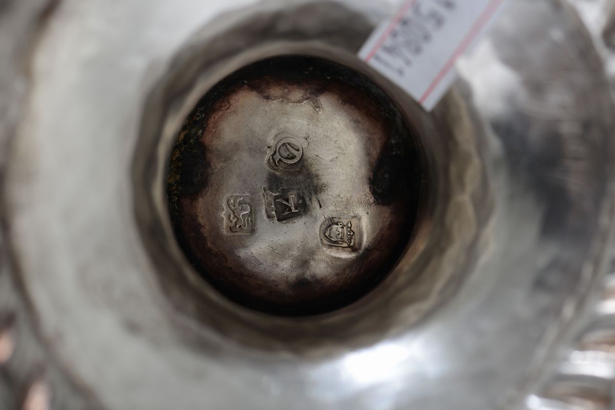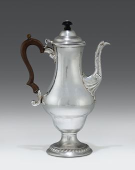 Caffettiera in argento fuso, sbalzato e cesellato, manico in legno sagomato, Inghilterra probabile XVIII secolo, punzoni della città di Londra per l’anno 1745 (?)