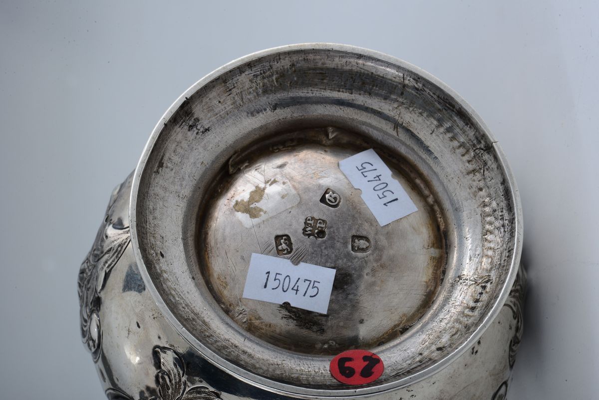 Caffettiera in argento sterling fuso, sbalzato e cesellato, Inghilterra XVIII secolo, città di Londra 1762, argentiere Wm. Plummer (?)