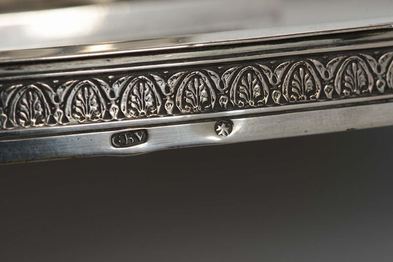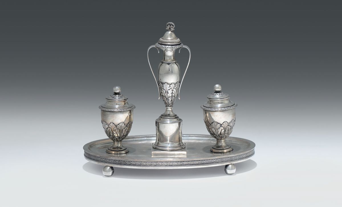 Calamaio in argento composto da vassoietto ovale contenente tre pezzi di gusto neoclassico riccamente sbalzati, Malta prima [..]