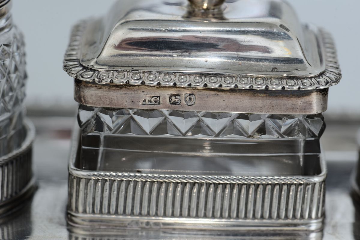 Calamaio in argento sterling e cristallo, Inghilterra XIX secolo, punzoni della città di Londra per l’anno 1829 e dell’argentiere John Clarke