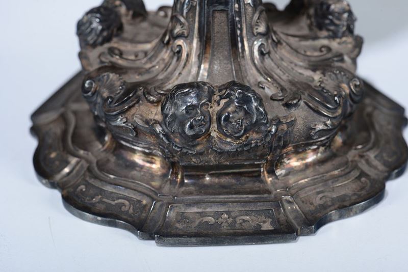 seleganti decori di gusto barocchetto con teste di cherubini, volute e pellacce.gr. 540, altezza cm 23