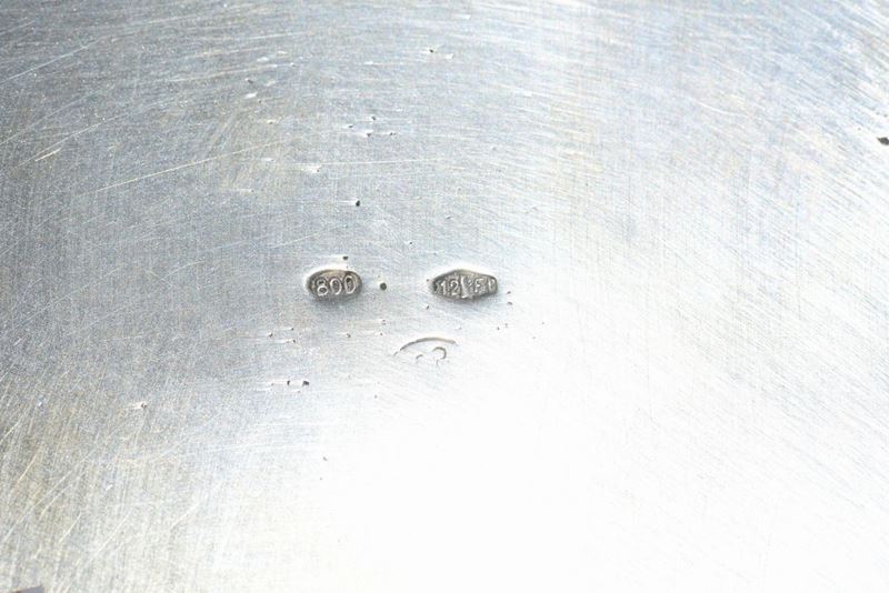 Centrotavola biansato in argento fuso, sbalzato e cesellato di gusto decò, argentiere Fiorentino, punzone con fascio littorio in uso tra il 1934 e il 1944