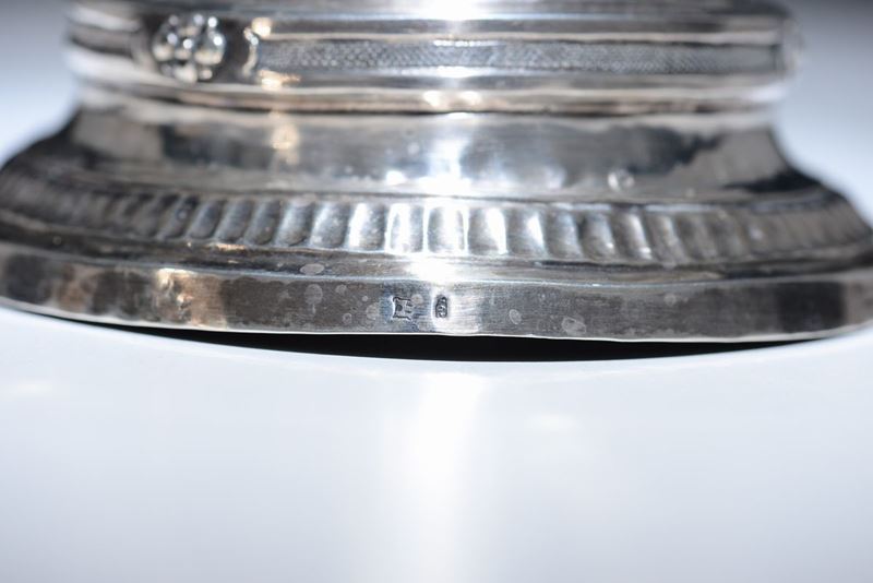 Coppia di candelieri in argento sbalzato e cesellato,Genova, punzone della Torretta per l’anno (1)797