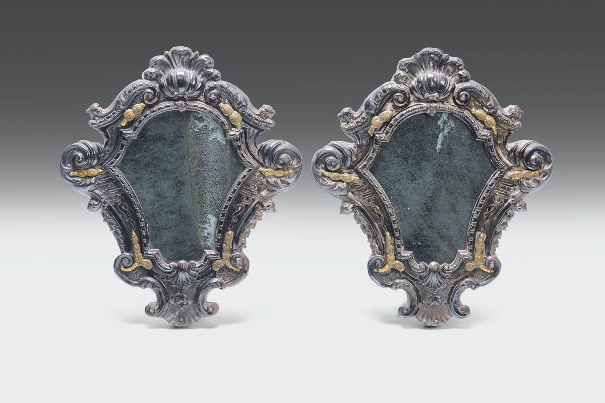 Coppia di specchierine in argento sbalzato, cesellato e dorato su supporto ligneo, Genova seconda metà del XVIII secolo, ripunzonatura ottocentesca con croce di S. Maurizio e delfino
