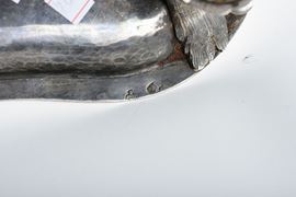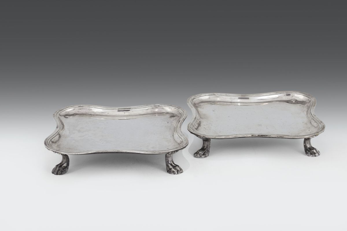 curioso compendio di porta biglietti a corpo quadrato con bordo sagomato poggiante su piedi ferini, di cui uno eseguito a Firenze a completamento di un primo romano dell'argentiere G.Valadier.gr. 1050, cm 22x22x4