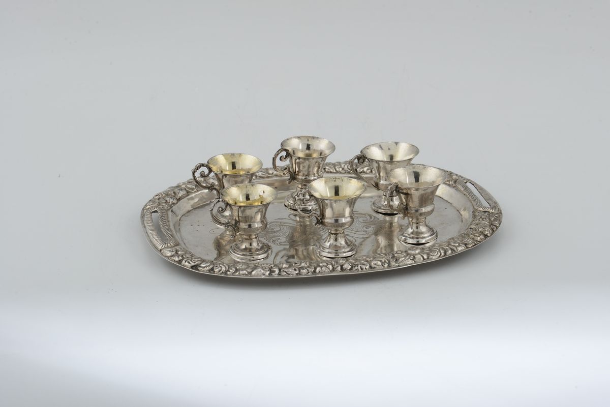 Insieme di sei tazzine da sorbetto e vassoio in argento sbalzato e cesellato, Italia XIX-XVIII secolo, vassoio con punzone di Napoli in uso dal saggiatore Paolo de Blasio dal 1832 al 1835, alcune tazzine punzonate con marchi in uso dal 1872 al 1934 (Italia torrita), altre con marchio 800
