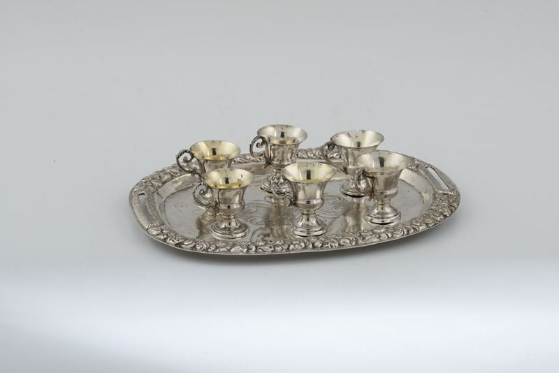 Insieme di sei tazzine da sorbetto e vassoio in argento sbalzato e cesellato, Italia XIX-XVIII secolo, vassoio con punzone [..]