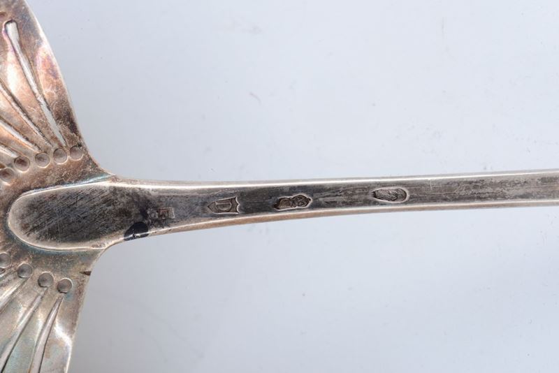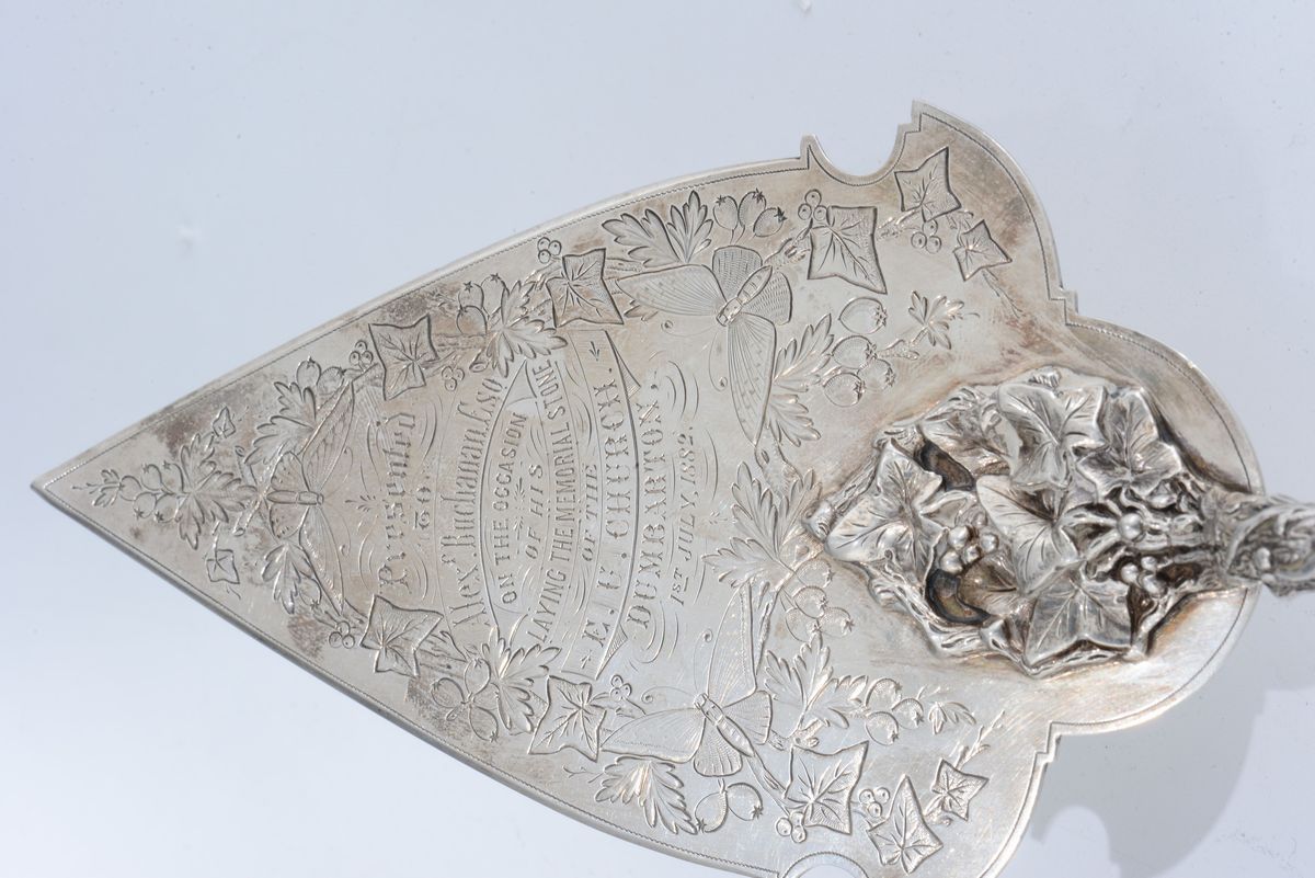 Mestolo in argento, Irlanda, XIX secolo e cazzuola in argento commemorativa per la posa della prima pietra della chiesa dell’unione evangelica di Dumbarton (scozia) datata 1882