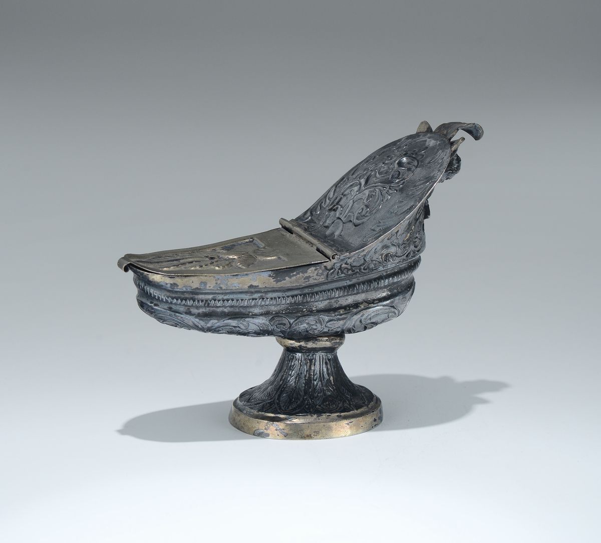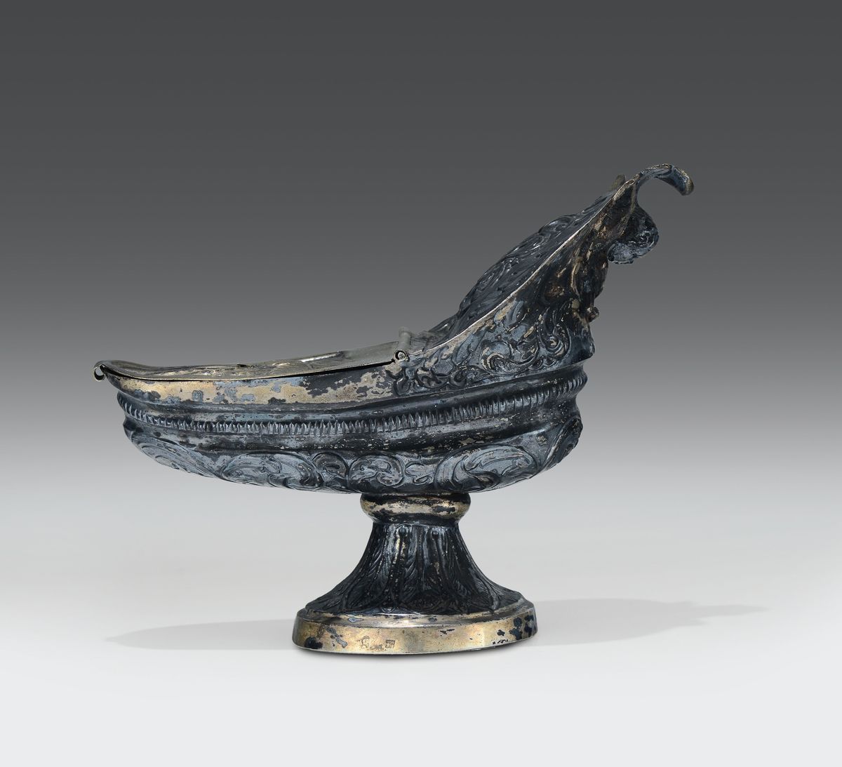 Navicella in argento sbalzato e cesellato con motivi fogliacei, Napoli inizi XIX secolo, saggiatore Paolo De Blasio (1832-1835)