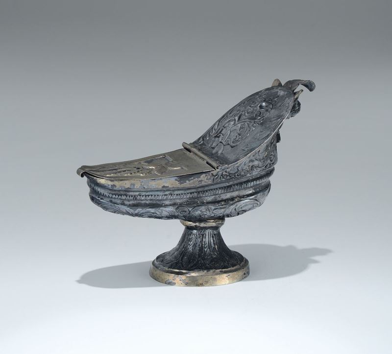 Navicella in argento sbalzato e cesellato con motivi fogliacei, Napoli inizi XIX secolo, saggiatore Paolo De Blasio (1832 [..]