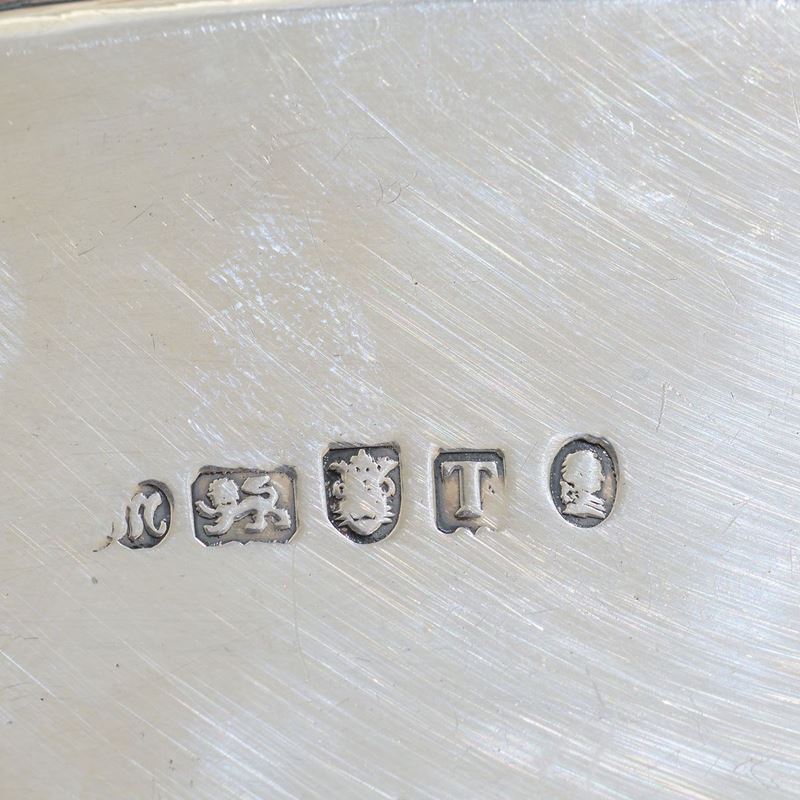 Salver in argento sterling fuso e cesellato, Inghilterra XIX secolo, bollo Londra 1814 e dell’argentiere (non leggibile)
