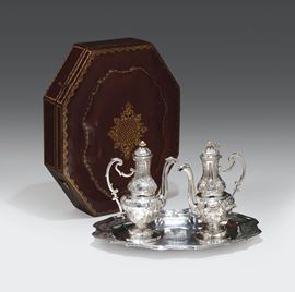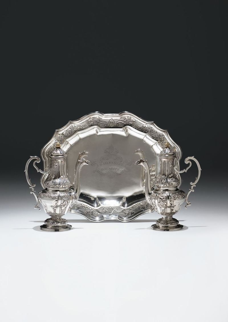 composto da vassoio e ampolle entro custodia in marocchino con impressioni in oro, vassoio mistilineo con bordo decorato a volute e grappoli d’uva recante al centro iscrizione entro riserva sormontata da insegna papale, San Silvestri in Capite 1770”. Due ampolle riccamente sbalzate e con versatoio terminante a testa di grifo e con presa dorata.vassoio cm 28x23gr. 940, cm 28x23 e altezza cm 17