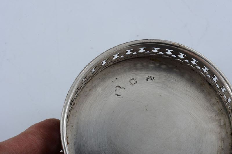 Set di sei sottobicchieri in argento con bordo a ringhiera traforata, Lombardo Veneto XIX secolo, punzone per i lavori minuti in uso da 1812 al 1872