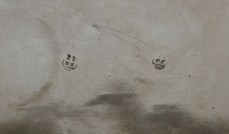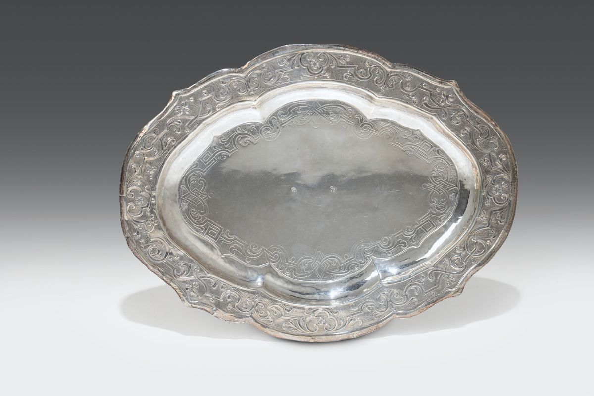 Bordo mistilineo con decori a volute alla “Beain”, del lotto fanno parte un fusto di calice in argento modificato a candeliere e un vasetto con coperchio in argento entrambi del XVIII secolo gr. 458, cm 23,5x18, altezze cm 19,5 e cm 9