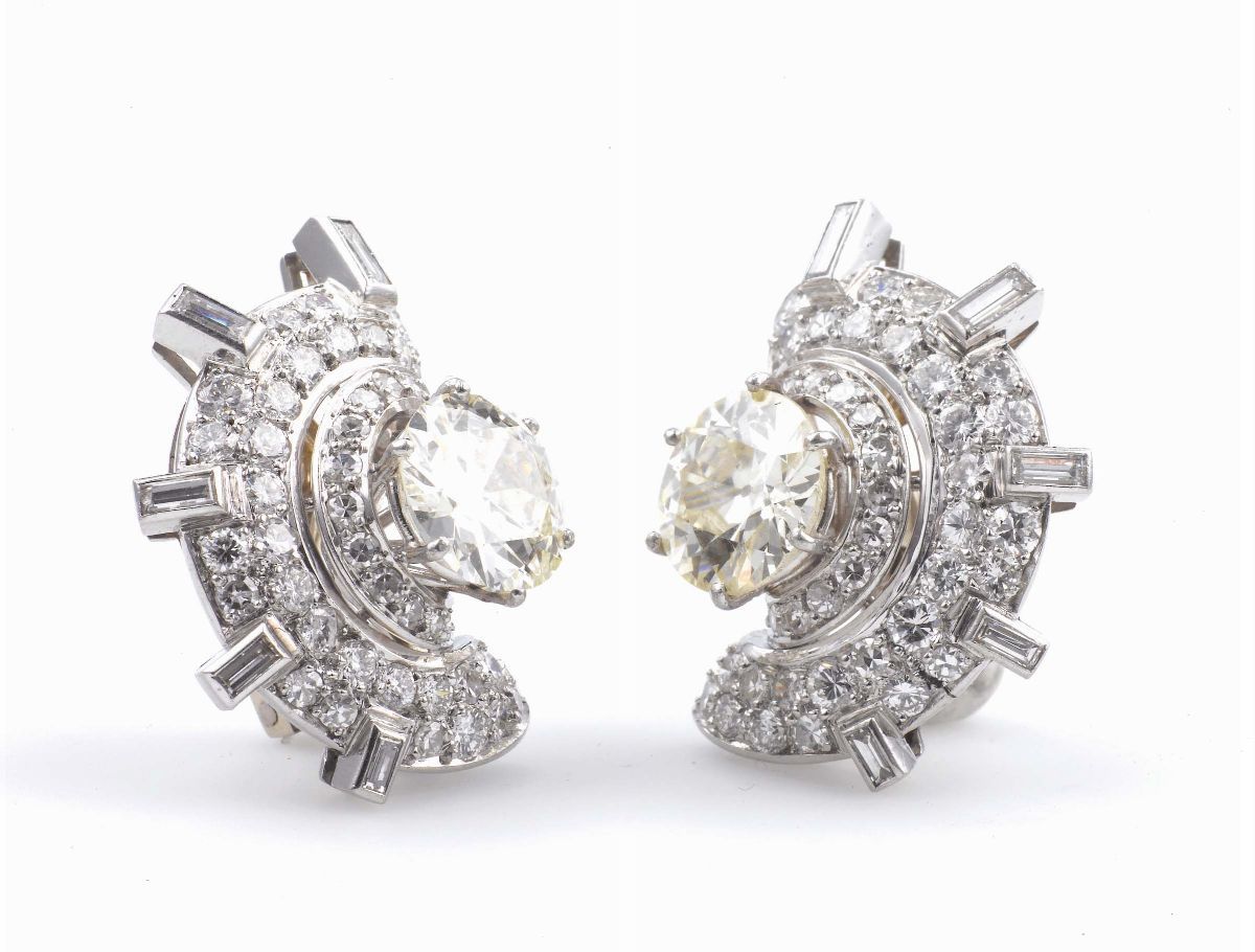 Orecchini Art Deco con diamanti centrali di vecchio taglio per ct 6,00 circa, diamanti taglio huit-huit e baguette a cont [..]